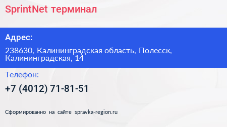 SprintNet, терминал по адресу 238630, Калининградская область, Полесск, Калининградская, 14 в дальнейшем Организация, размещена в следующих категориях: