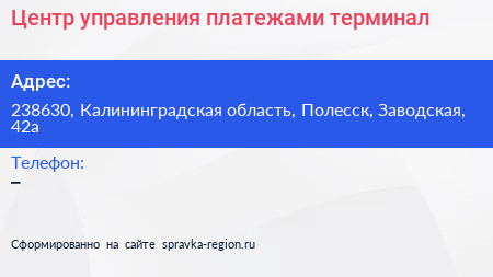 Центр управления платежами, терминал по адресу 238630, Калининградская область, Полесск, Заводская, 42а в дальнейшем Организация, размещена в следующих категориях: