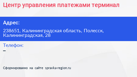 Центр управления платежами, терминал по адресу 238651, Калининградская область, Полесск, Калининградская, 28 в дальнейшем Организация, размещена в следующих категориях: