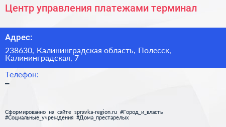 Центр управления платежами, терминал по адресу 238630, Калининградская область, Полесск, Калининградская, 7 в дальнейшем Организация, размещена в следующих категориях: