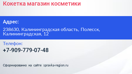 Кокетка, магазин косметики по адресу 238630, Калининградская область, Полесск, Калининградская, 12 в дальнейшем Организация, размещена в следующих категориях:
