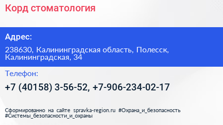 Корд, стоматология по адресу 238630, Калининградская область, Полесск, Калининградская, 34 в дальнейшем Организация, размещена в следующих категориях: