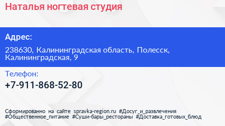 Наталья, ногтевая студия по адресу 238630, Калининградская область, Полесск, Калининградская, 9 в дальнейшем Организация, размещена в следующих категориях: