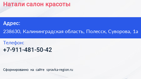Натали, салон красоты по адресу 238630, Калининградская область, Полесск, Суворова, 1а в дальнейшем Организация, размещена в следующих категориях: