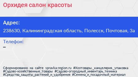 Орхидея, салон красоты по адресу 238630, Калининградская область, Полесск, Почтовая, 3а в дальнейшем Организация, размещена в следующих категориях: