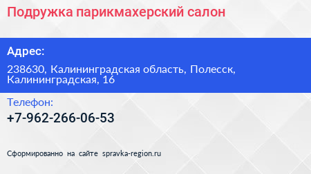 Подружка, парикмахерский салон по адресу 238630, Калининградская область, Полесск, Калининградская, 16 в дальнейшем Организация, размещена в следующих категориях: