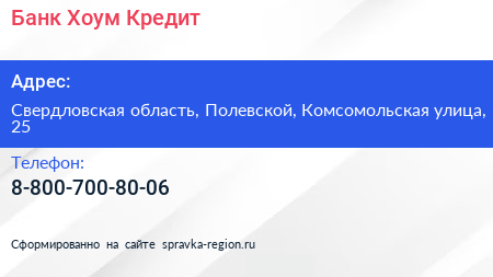 Банк Хоум Кредит по адресу Свердловская область, Полевской, Комсомольская улица, 25 в дальнейшем Организация, размещена в следующих категориях: