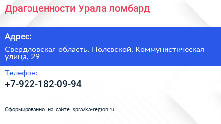 Драгоценности Урала, ломбард по адресу Свердловская область, Полевской, Коммунистическая улица, 29 в дальнейшем Организация, размещена в следующих категориях: