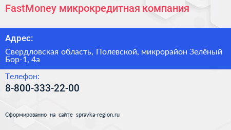 FastMoney, микрокредитная компания по адресу Свердловская область, Полевской, микрорайон Зелёный Бор-1, 4а в дальнейшем Организация, размещена в следующих категориях: