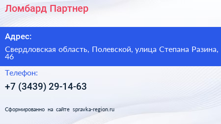 Ломбард Партнер по адресу Свердловская область, Полевской, улица Степана Разина, 46 в дальнейшем Организация, размещена в следующих категориях: