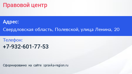 Правовой центр по адресу Свердловская область, Полевской, улица Ленина, 20 в дальнейшем Организация, размещена в следующих категориях: