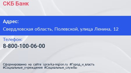 СКБ-Банк по адресу Свердловская область, Полевской, улица Ленина, 12 в дальнейшем Организация, размещена в следующих категориях:
