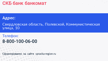 СКБ-банк, банкомат по адресу Свердловская область, Полевской, Коммунистическая улица, 10 в дальнейшем Организация, размещена в следующих категориях: