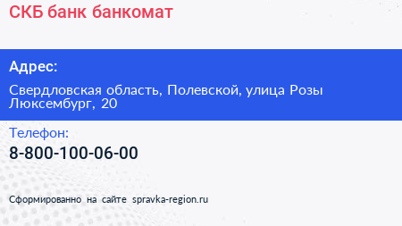СКБ-банк, банкомат по адресу Свердловская область, Полевской, улица Розы Люксембург, 20 в дальнейшем Организация, размещена в следующих категориях: