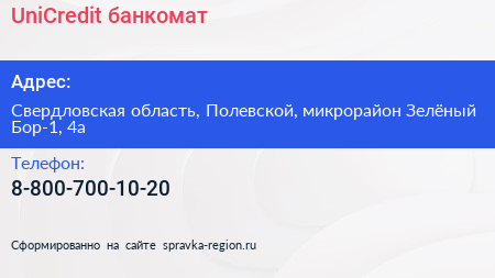 UniCredit, банкомат по адресу Свердловская область, Полевской, микрорайон Зелёный Бор-1, 4а в дальнейшем Организация, размещена в следующих категориях: