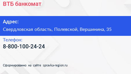 ВТБ, банкомат по адресу Свердловская область, Полевской, Вершинина, 35 в дальнейшем Организация, размещена в следующих категориях:
