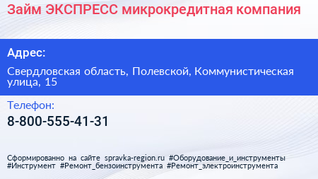 Займ ЭКСПРЕСС, микрокредитная компания по адресу Свердловская область, Полевской, Коммунистическая улица, 15 в дальнейшем Организация, размещена в следующих категориях: