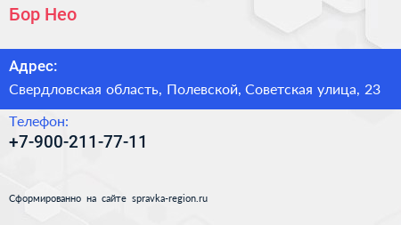 Бор Нео по адресу Свердловская область, Полевской, Советская улица, 23 в дальнейшем Организация, размещена в следующих категориях:
