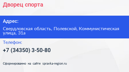 Дворец спорта по адресу Свердловская область, Полевской, Коммунистическая улица, 31а в дальнейшем Организация, размещена в следующих категориях: