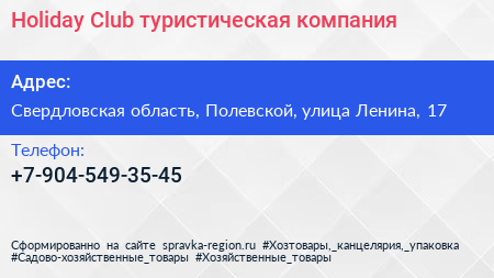 Holiday Club, туристическая компания по адресу Свердловская область, Полевской, улица Ленина, 17 в дальнейшем Организация, размещена в следующих категориях:
