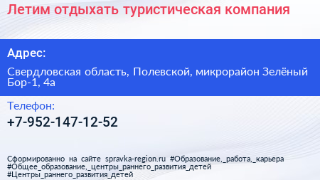 Летим отдыхать, туристическая компания по адресу Свердловская область, Полевской, микрорайон Зелёный Бор-1, 4а в дальнейшем Организация, размещена в следующих категориях: