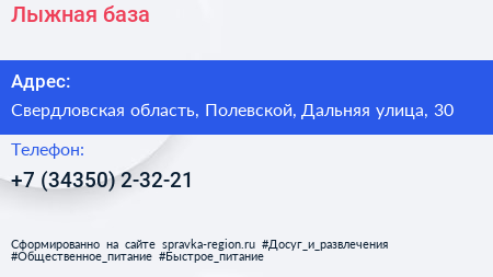 Лыжная база по адресу Свердловская область, Полевской, Дальняя улица, 30 в дальнейшем Организация, размещена в следующих категориях: