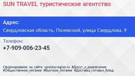 SUN TRAVEL, туристическое агентство по адресу Свердловская область, Полевской, улица Свердлова, 9 в дальнейшем Организация, размещена в следующих категориях: