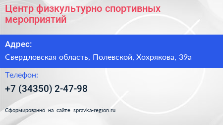 Центр физкультурно-спортивных мероприятий по адресу Свердловская область, Полевской, Хохрякова, 39а в дальнейшем Организация, размещена в следующих категориях: