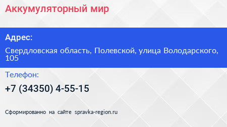 Аккумуляторный мир по адресу Свердловская область, Полевской, улица Володарского, 105 в дальнейшем Организация, размещена в следующих категориях: