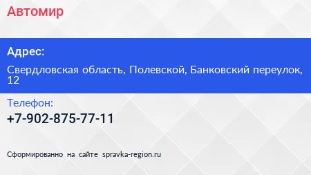 Автомир по адресу Свердловская область, Полевской, Банковский переулок, 12 в дальнейшем Организация, размещена в следующих категориях: