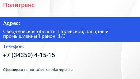 Политранс по адресу Свердловская область, Полевской, Западный промышленный район, 1/3 в дальнейшем Организация, размещена в следующих категориях: