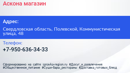 Аскона, магазин по адресу Свердловская область, Полевской, Коммунистическая улица, 48 в дальнейшем Организация, размещена в следующих категориях: