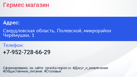 Гермес, магазин по адресу Свердловская область, Полевской, микрорайон Черёмушки, 1 в дальнейшем Организация, размещена в следующих категориях: