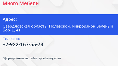 Много Мебели по адресу Свердловская область, Полевской, микрорайон Зелёный Бор-1, 4а в дальнейшем Организация, размещена в следующих категориях: