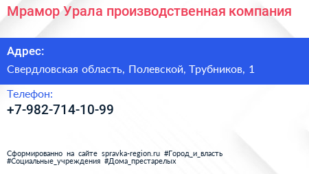 Мрамор Урала, производственная компания по адресу Свердловская область, Полевской, Трубников, 1 в дальнейшем Организация, размещена в следующих категориях: