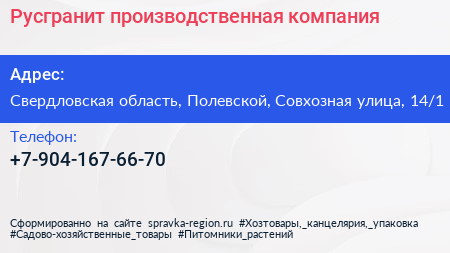 Русгранит, производственная компания по адресу Свердловская область, Полевской, Совхозная улица, 14/1 в дальнейшем Организация, размещена в следующих категориях: