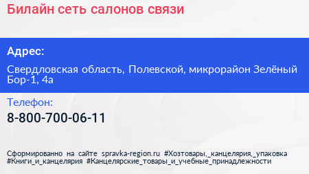 Билайн, сеть салонов связи по адресу Свердловская область, Полевской, микрорайон Зелёный Бор-1, 4а в дальнейшем Организация, размещена в следующих категориях: