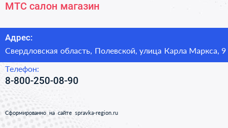 МТС, салон-магазин по адресу Свердловская область, Полевской, улица Карла Маркса, 9 в дальнейшем Организация, размещена в следующих категориях:
