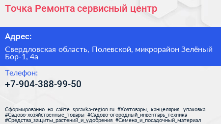 Точка Ремонта, сервисный центр по адресу Свердловская область, Полевской, микрорайон Зелёный Бор-1, 4а в дальнейшем Организация, размещена в следующих категориях: