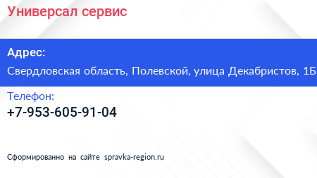 Универсал-сервис по адресу Свердловская область, Полевской, улица Декабристов, 1Б в дальнейшем Организация, размещена в следующих категориях: