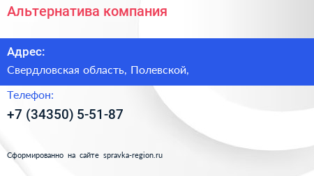 Альтернатива, компания по адресу Свердловская область, Полевской, в дальнейшем Организация, размещена в следующих категориях: