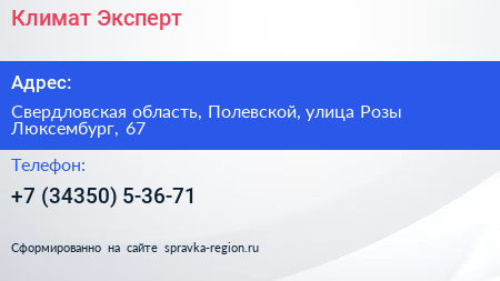 Климат Эксперт по адресу Свердловская область, Полевской, улица Розы Люксембург, 67 в дальнейшем Организация, размещена в следующих категориях: