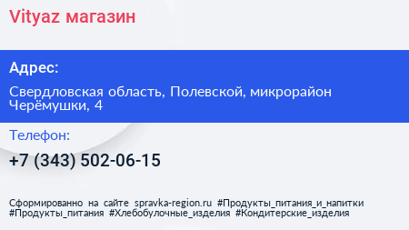 Vityaz, магазин по адресу Свердловская область, Полевской, микрорайон Черёмушки, 4 в дальнейшем Организация, размещена в следующих категориях: