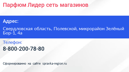 Парфюм-Лидер, сеть магазинов по адресу Свердловская область, Полевской, микрорайон Зелёный Бор-1, 4а в дальнейшем Организация, размещена в следующих категориях: