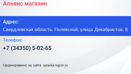 Альянс, магазин по адресу Свердловская область, Полевской, улица Декабристов, 8 в дальнейшем Организация, размещена в следующих категориях: