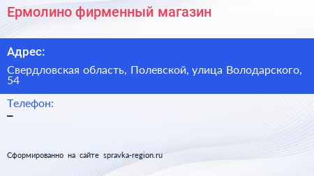 Ермолино, фирменный магазин по адресу Свердловская область, Полевской, улица Володарского, 54 в дальнейшем Организация, размещена в следующих категориях: