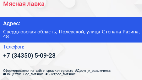 Мясная лавка по адресу Свердловская область, Полевской, улица Степана Разина, 48 в дальнейшем Организация, размещена в следующих категориях: