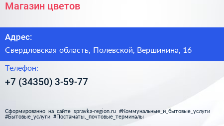 Магазин цветов по адресу Свердловская область, Полевской, Вершинина, 16 в дальнейшем Организация, размещена в следующих категориях: