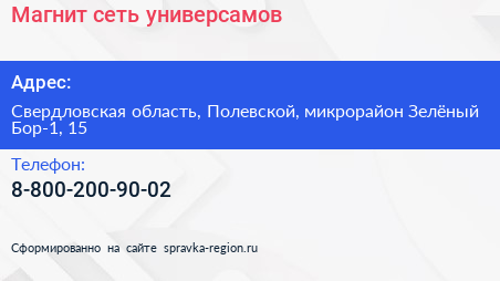 Магнит, сеть универсамов по адресу Свердловская область, Полевской, микрорайон Зелёный Бор-1, 15 в дальнейшем Организация, размещена в следующих категориях: