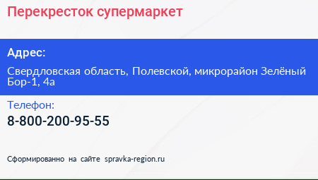 Перекресток, супермаркет по адресу Свердловская область, Полевской, микрорайон Зелёный Бор-1, 4а в дальнейшем Организация, размещена в следующих категориях: